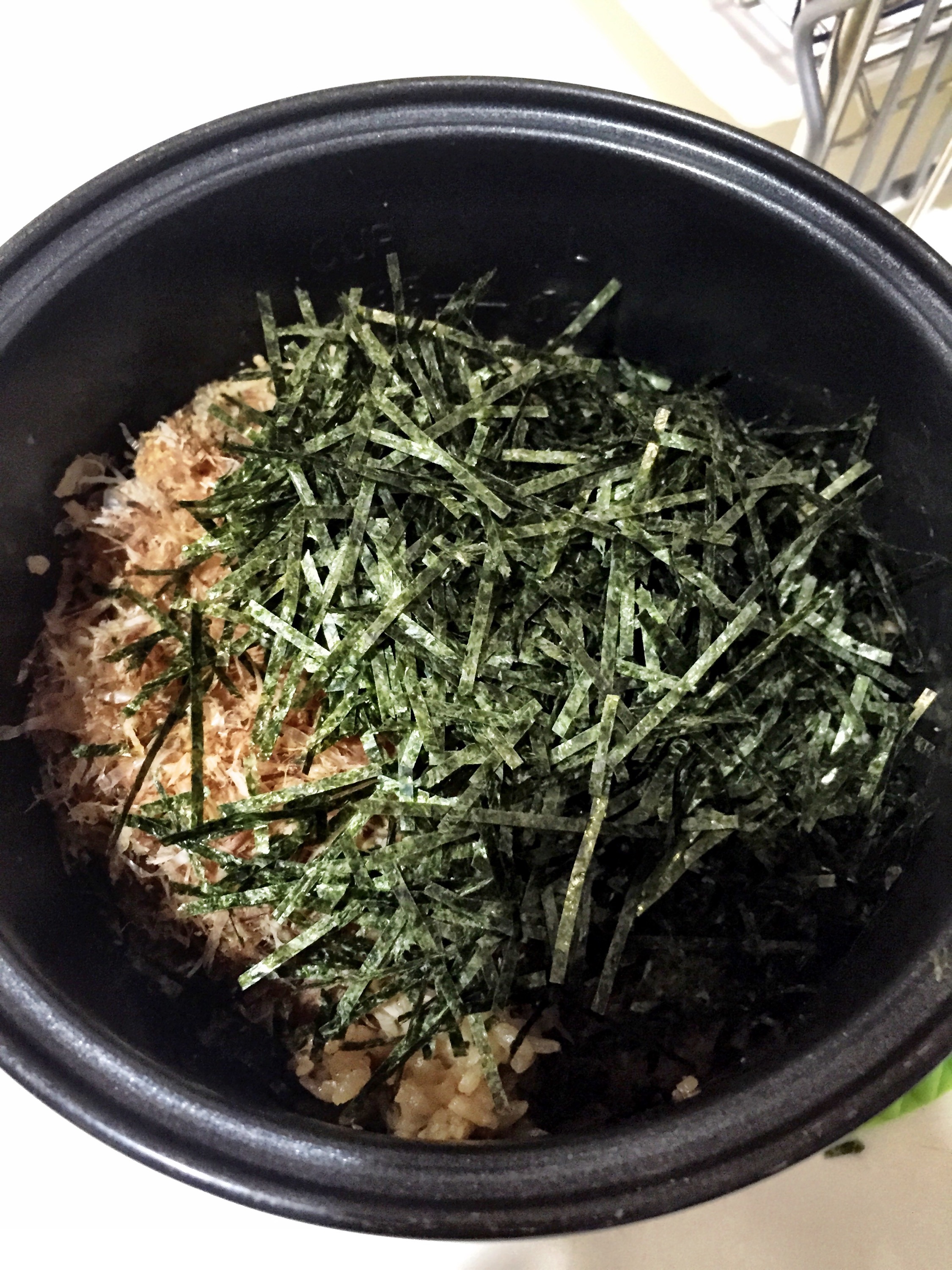 Cook rice with mixture in rice cooker and when done, let it steam for another 10min. Then add the other ingredients – furikake, bonito and seaweed. Mix well.