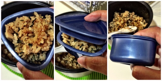 Using the onigiri mold, put slightly more rice and cover with the base to ensure a compact riceball can be made. Press tightly and dispense the rice ball using the triangular ‘lever’ to push rice ball from mold. Tada! Perfectly shaped onigiris!