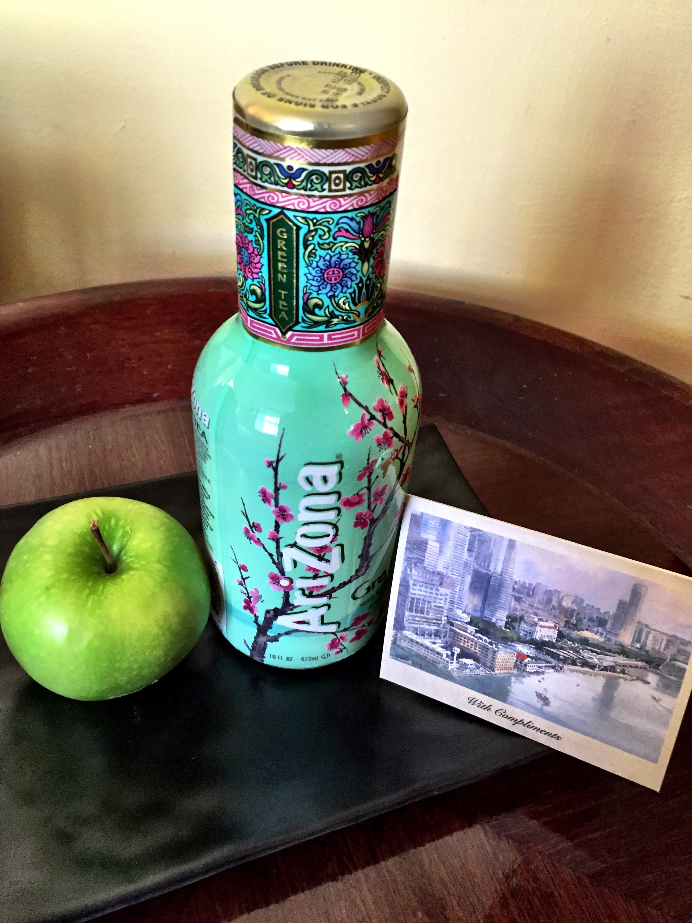 The hotel staff who served us was kind to note our birthday and anniversary. A big slice of chocolate ganache cake, strawberries and a bottle of red wine were sent up to our room. We ate the cake with strawberries. Yummy!