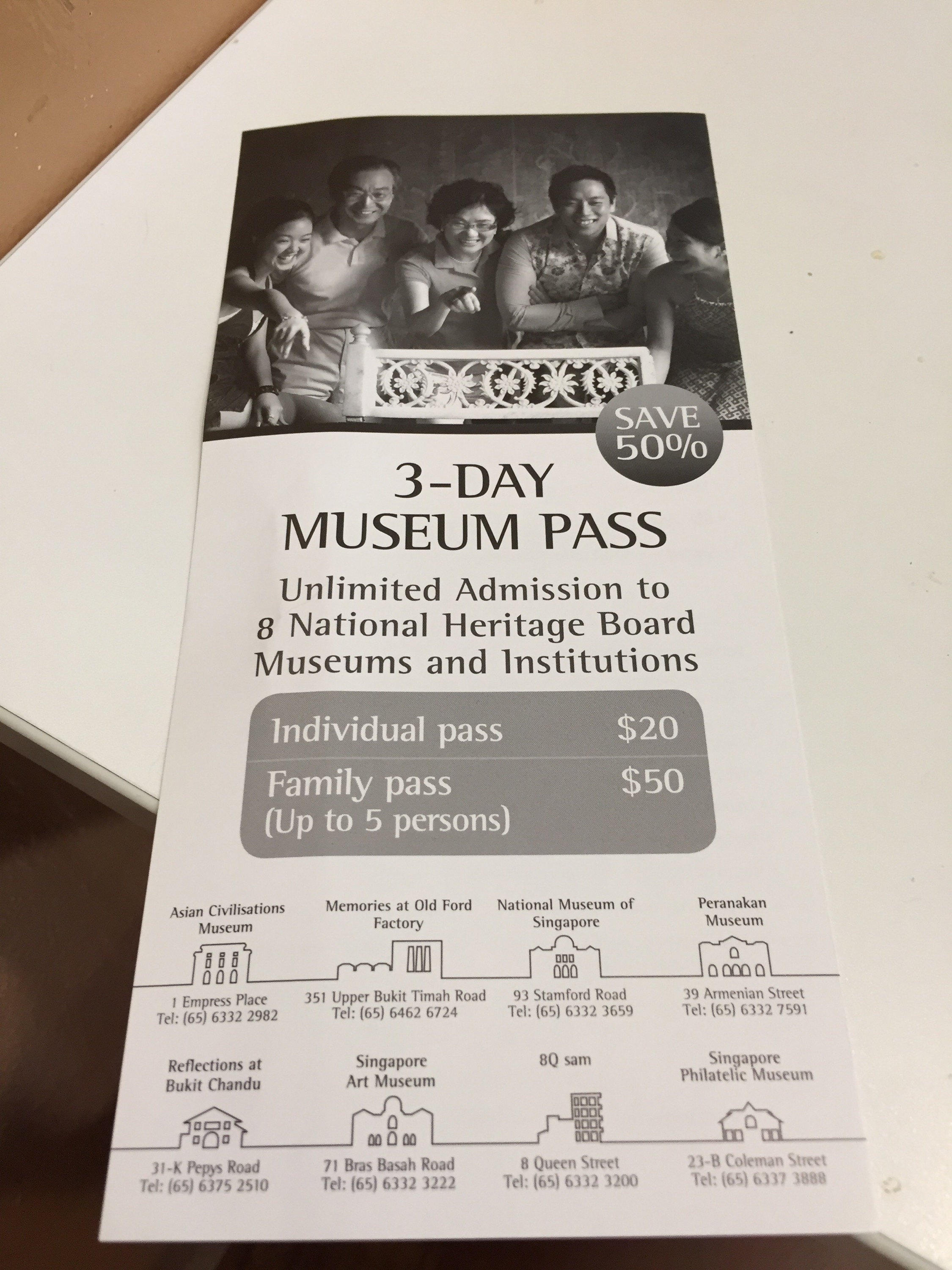 For Singaporeans, there is free admission for all NHB (National Heritage Board) managed museums. Foreigners or visitors will need to pay a nominal amount and there are packages or passes available.