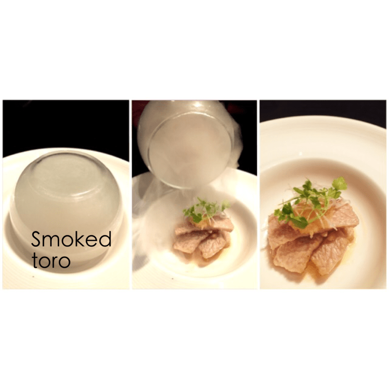 Comes smoked in a glass bowl on top of the slider toro, the dish looked pretty. However the smokiness was very light, insufficient to enhance the lightly seared pieces of yumminess.