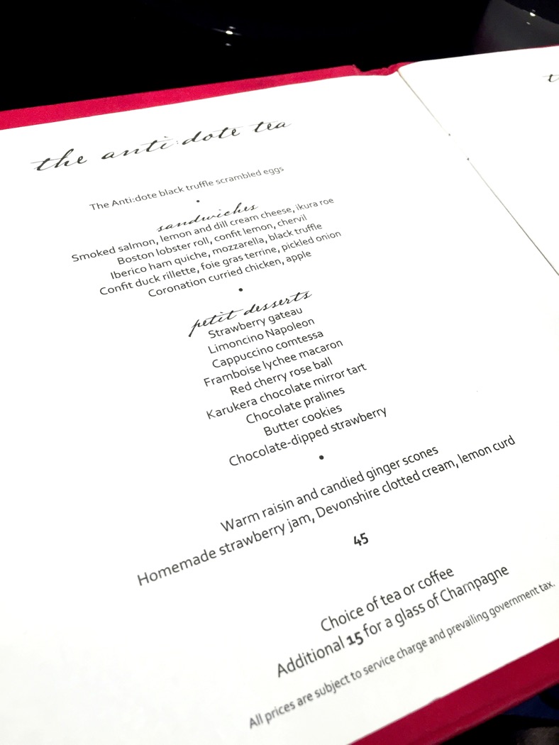 We finally had a chance to check out their afternoon tea at $45++ per person. They have kids menu too ($15++) and it’s written in kiddy handwriting.