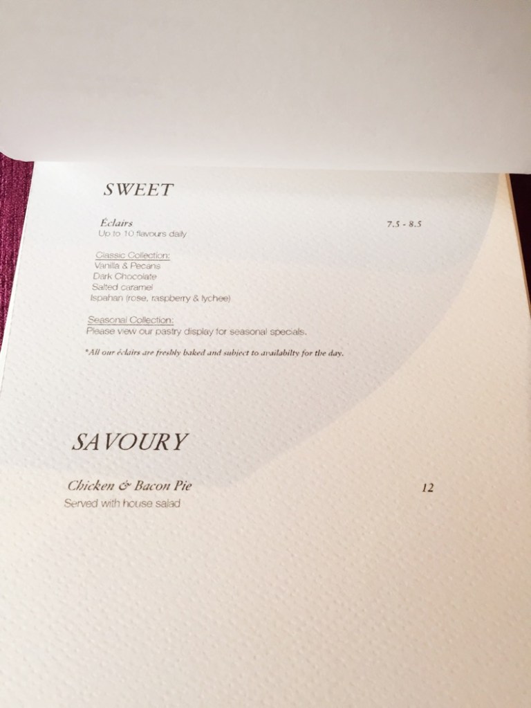 We loved all their eclairs. However, the pie was too sweet for me but the salad which was served together was delicious. The full menu is provided below.