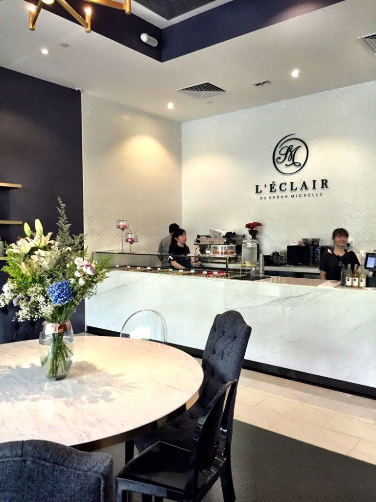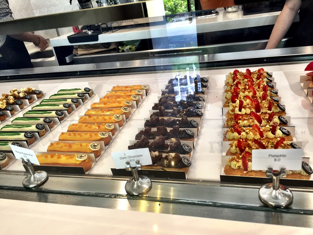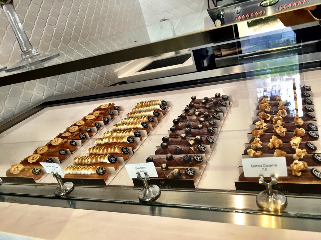 A new sweets shop opened last week at the Singapore Shopping Center (190 Clemenceau Ave). 2 young pastry chefs, Michelle Looi and Sarah Tan graduated from Le Cordon Bleu and wanted to take specialty eclairs to the next level in Singapore. There were no cakes or other desserts, just 8 – 10 flavors of eclairs each day. The only savory item on their menu is chicken bacon pie.