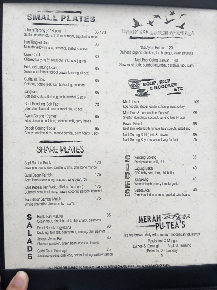 The good – always consistent, delivering delicious Indonesian fare. This time we had their island cooler drink, ikan tongkol Gohu (tuna tartar or similar), mud crab pungsit (shellfish dunplings), sapi bumbu rujak (beef cheek and bone marrow). All very delicious and great with rice. All 3 dishes and 1 drink cost us about IDR460k.