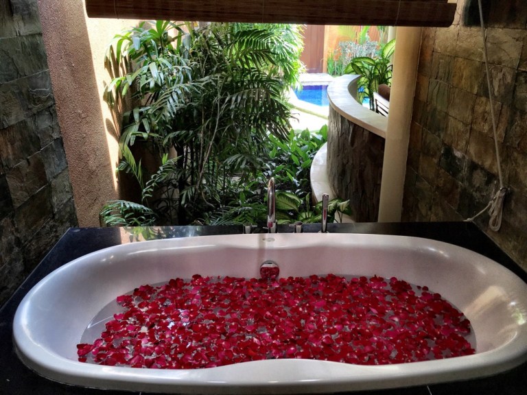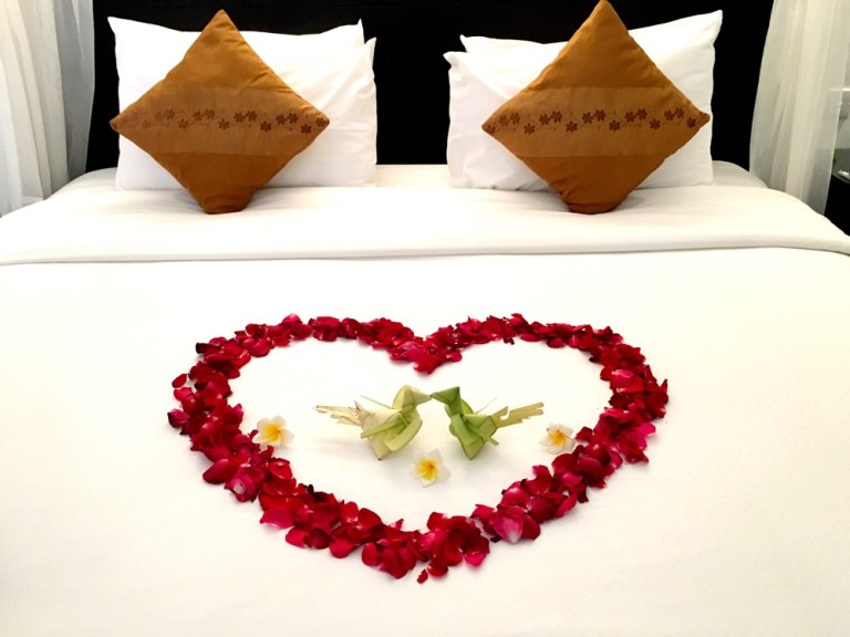 It was a nice thought for all the petals on the bed and tub but we did not fancy those. We’d rather prefer clean and simple white beds and tubs.