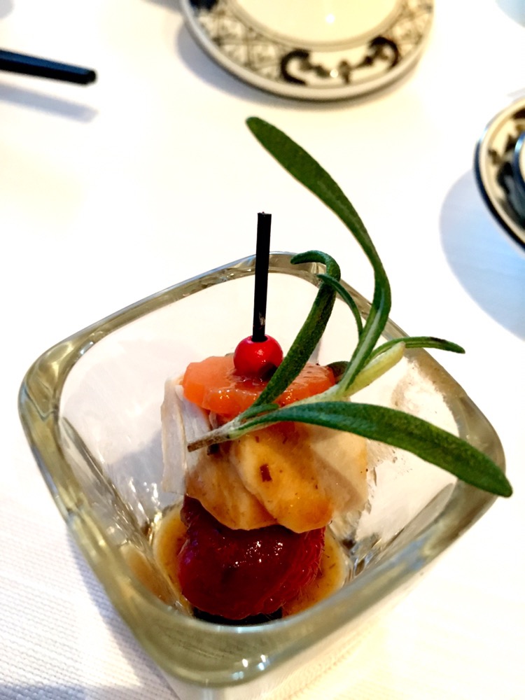 Now let’s move on to dinner. We sort of regretted not ordering ala carte. Blame it on laziness, we picked the $138 per pax course. Starters of sweet cashew and taro/ yam chips were delicious. However we were then served this chilled chicken tomato appetizer which was strange. It did not have much taste but anyway, we thought we were off to a great start…