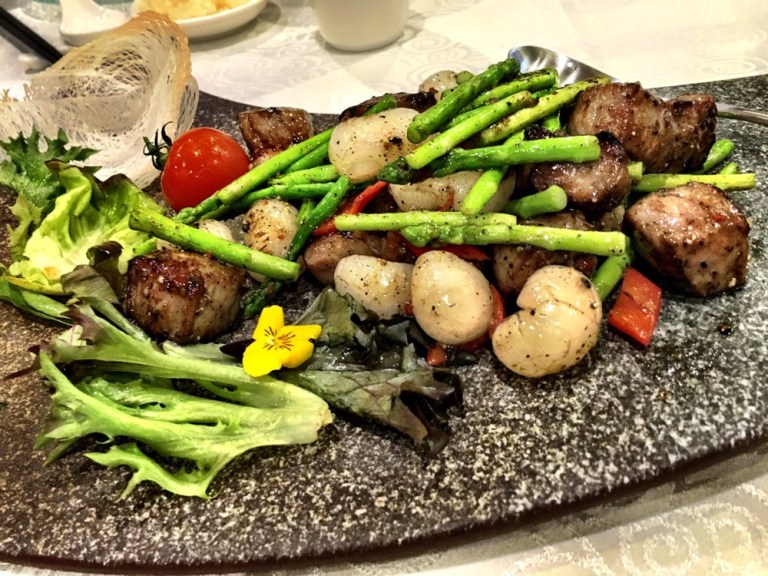Stir fried Wagyu beef cubes with black pepper and Longan were served medium. They were little tasty morsels of tender, well prepared meat with some baby asparagus and interestingly accompanied with longans. The presentation of this dish does not do justice for its taste.