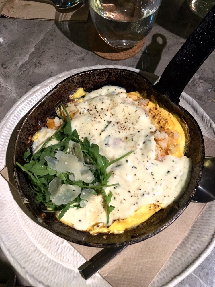 The two of us shared a starter of coal baked omelette with smoked haddock, tarragon and grain mustard mornay $27. It was a nice moist omelette, haddock was quite salty as they weren’t evenly distributed so some parts of the omelette were bland (here’s where the sauce from the sweet potato leaf comes in) while some parts too salty. Otherwise, the dish was quite satisfying.