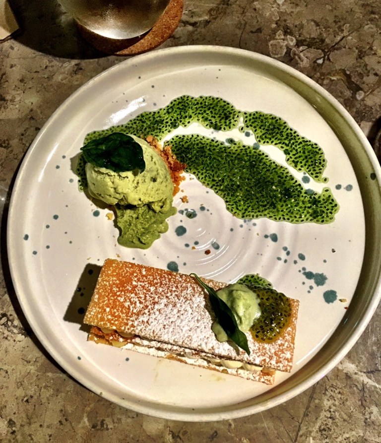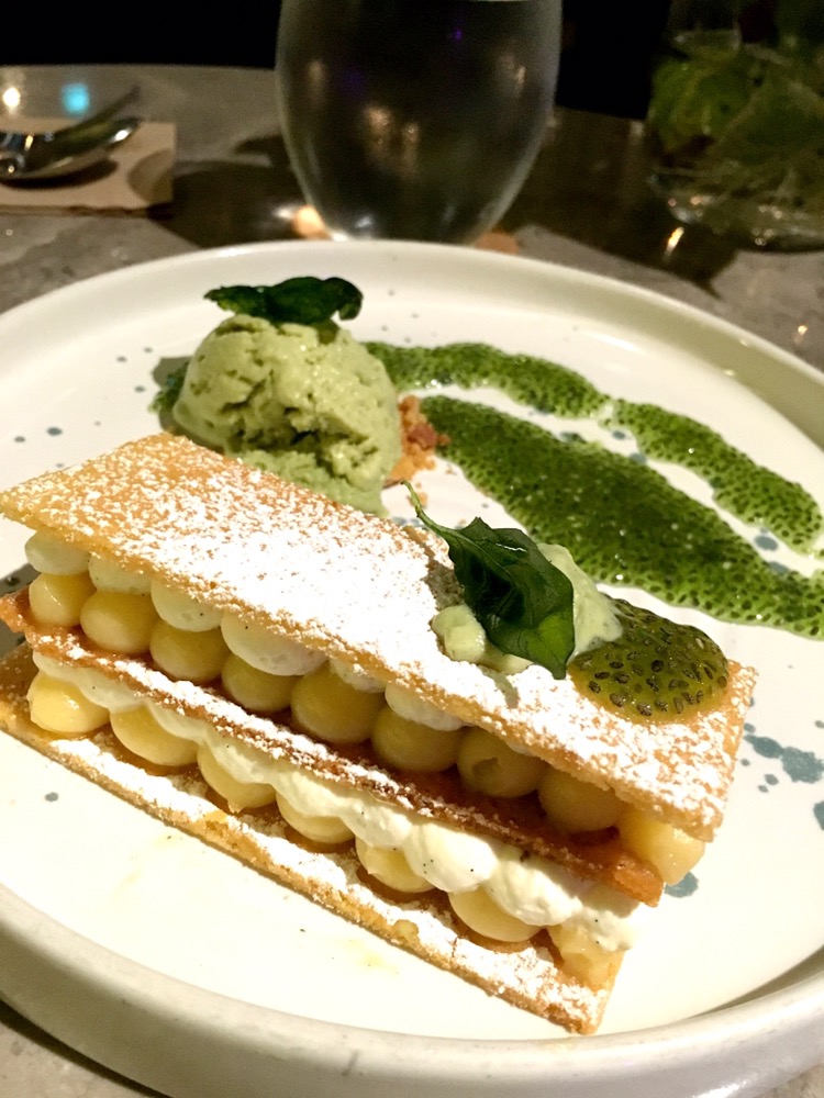 For dessert, we shared a lemon tart with basil ice cream $18. We love lemon tarts but the description did not sound exciting. However, surprise! the tart was served like a millefeuille with lemon curd and cream piped between sables. Chia seed basil sauce almost like jelly and the basil ice cream. A very delightful combination. We enjoyed it. Coffee was from Common man roasters and we loved their coffee when we visited. So it did not disappoint this time.