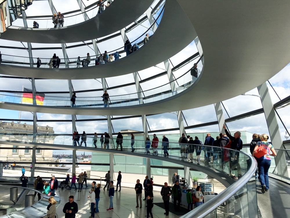 - Then make an appointment online to visit the Bundestag – Reichstag building. The dome is energy efficient, environmentally friendly and beautiful! Each visitor gets a local language portable device/ ear piece which detects our location around the dome and provides appropriate information wherever we walked to. Very cool! The views were amazing too.