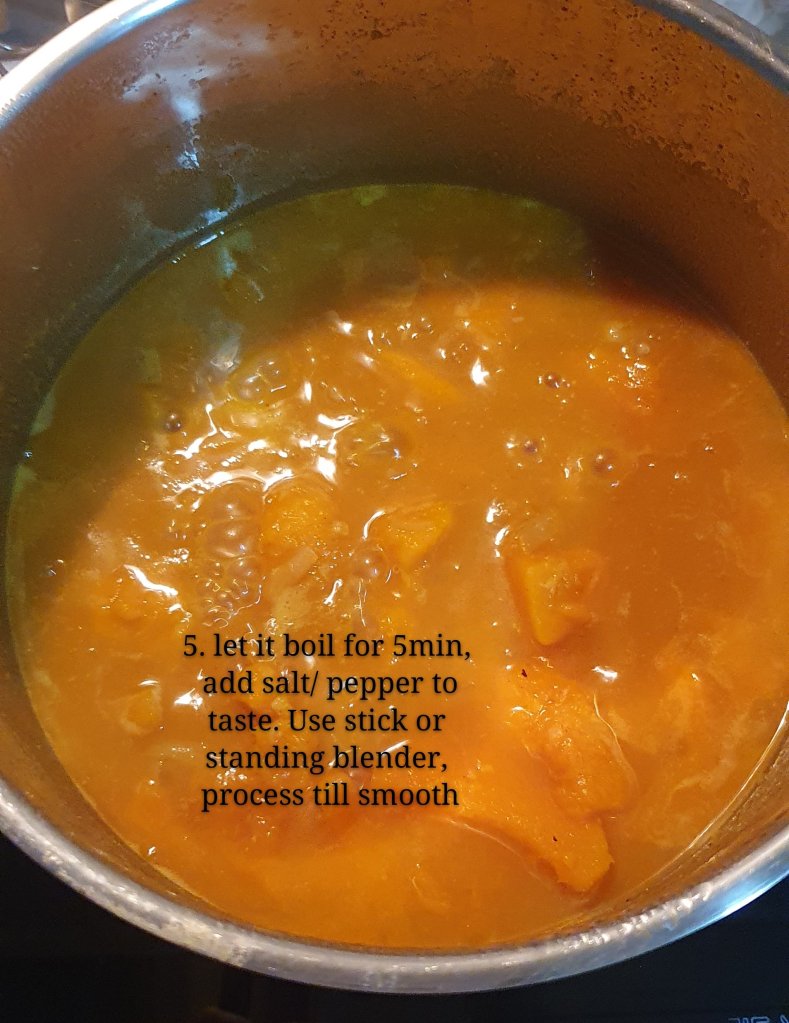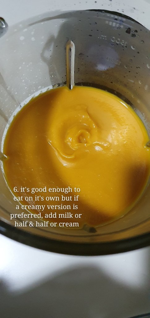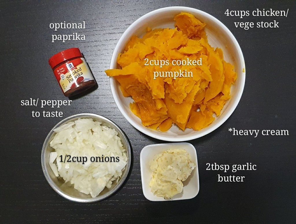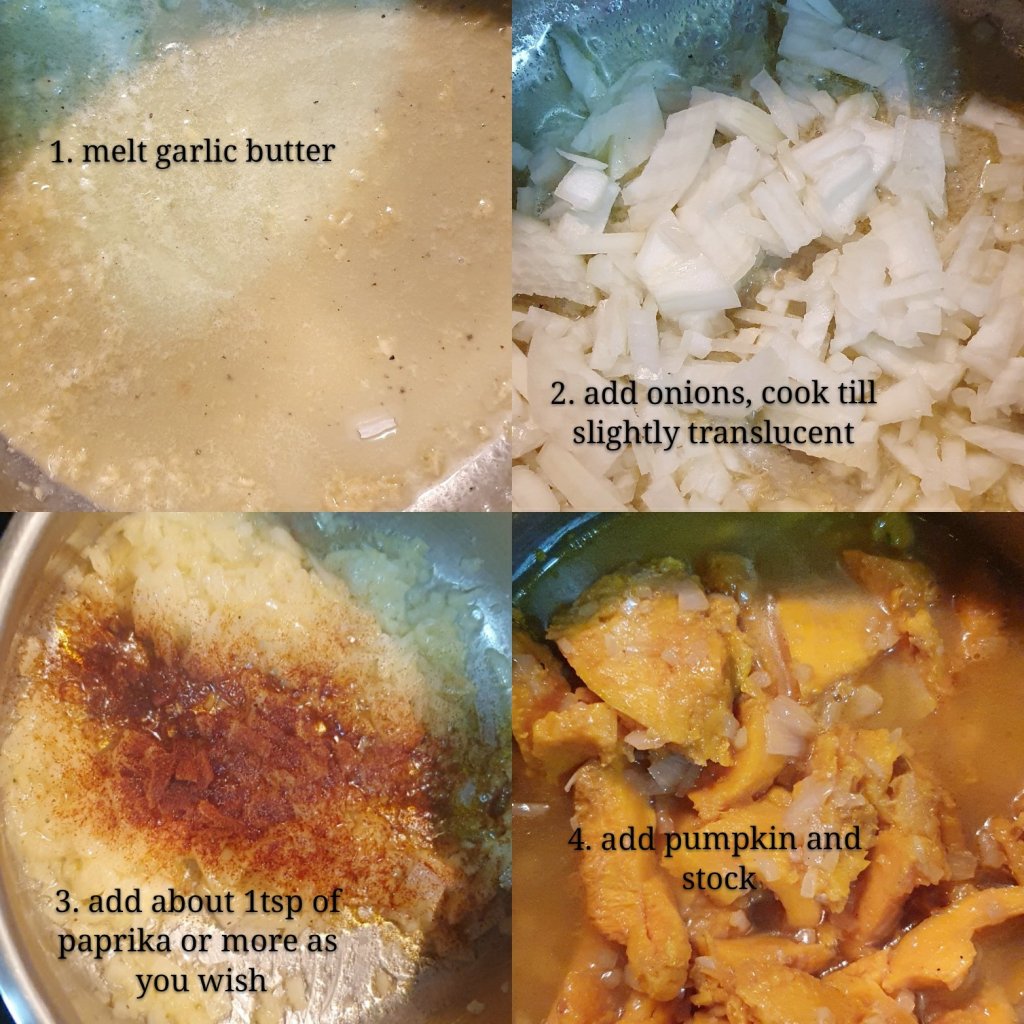 We were gifted with a japanese pumpkin and there’s available chicken stock, onions, garlic butter, turmeric, smoked paprika and cream in the pantry. So its pumpkin soup!